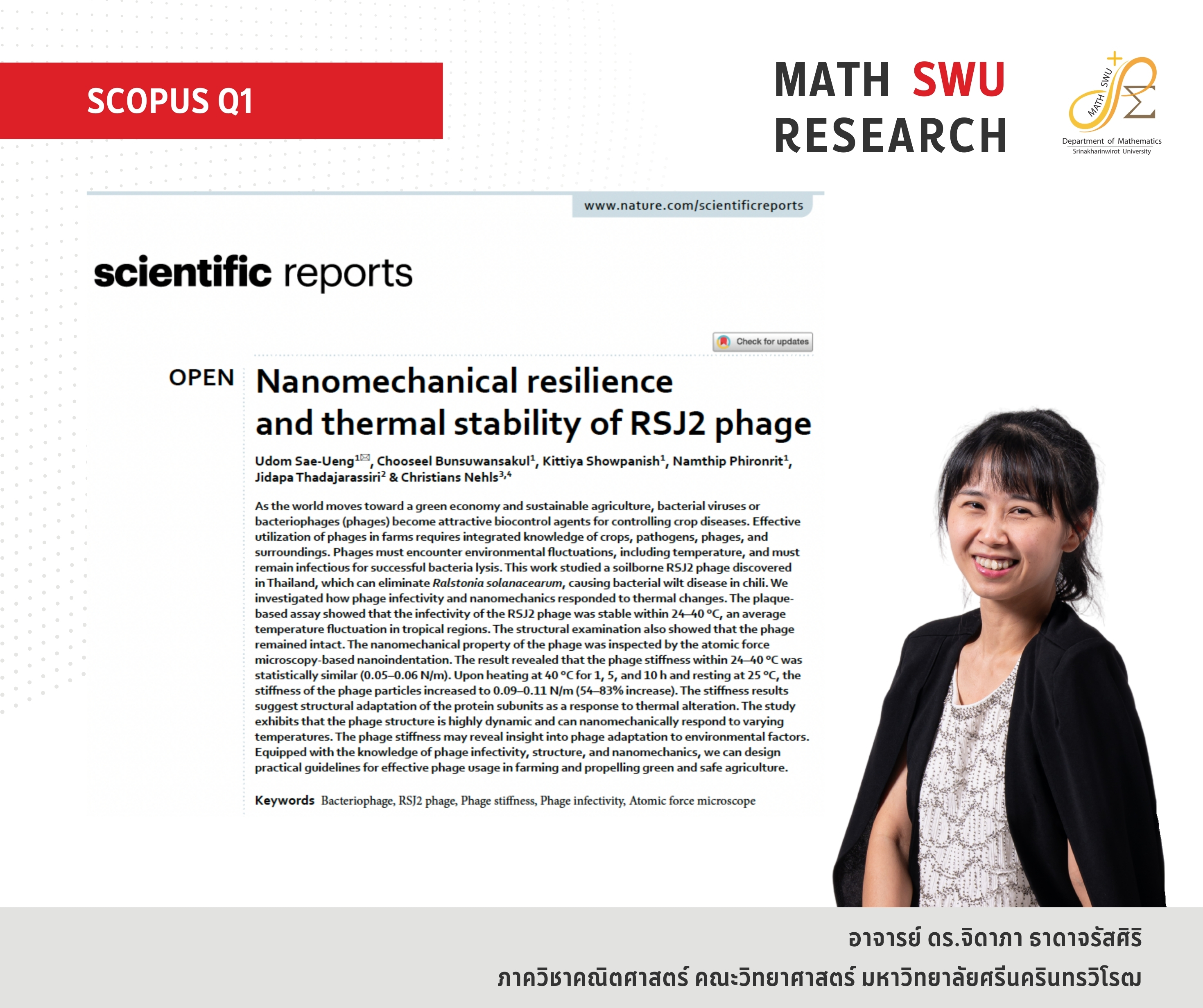 อ. ดร.จิดาภา ธาดาจรัสศิริ งานวิจัย : Nanomechanical resilience and thermal stability of RSJ2 phage วารสาร : Scientific Reports